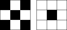 当参数“minimal_group_size”= 2时,第一个算法启动。它将`erosion <https://docs.opencv.org/3.4/db/df6/tutorial_erosion_dilatation.html>`_ 函数应用于下方图片中的内核(如果“group_connectivity_type”= 4,则使用左侧内核;如果“group_connectivity_type”= 8,则使用右侧内核),作用于costmap上。内核像素的白色表示使用该值,黑色表示忽略该值。