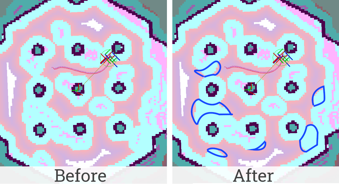 当参数``minimal_group_size`` > 2时,执行第二种算法。这是一种通用解决方案,可以删除邻近障碍物组,如果它们的总数小于``minimal_group_size``。为了选择相邻障碍物组,算法执行它们的分割。一个段中的细胞连接类型由参数``group_connectivity_type``确定。然后计算每个段的大小。大小小于``minimal_group_size``的障碍物段将被替换为空细胞。该算法比第一种算法慢大约10倍,因此请谨慎使用,仅在必要时使用。它的执行时间取决于处理地图片段的大小(而不取决于``minimal_group_size``的值)。